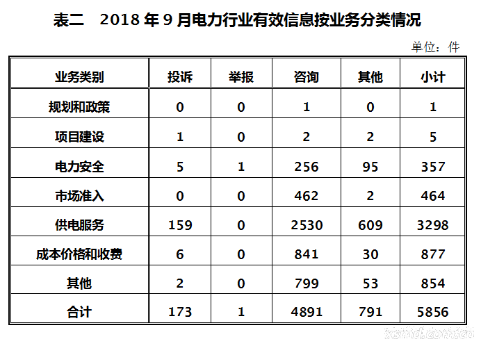 2018年9月收到的有效信息中,電力行業類5856件,占75.58%;新能源和可再生能源行業類844件,占10.89%;石油天然氣行業類208件,占2.69%;煤炭行業類6件,占0.08%;其他事項834件,占10.76%。