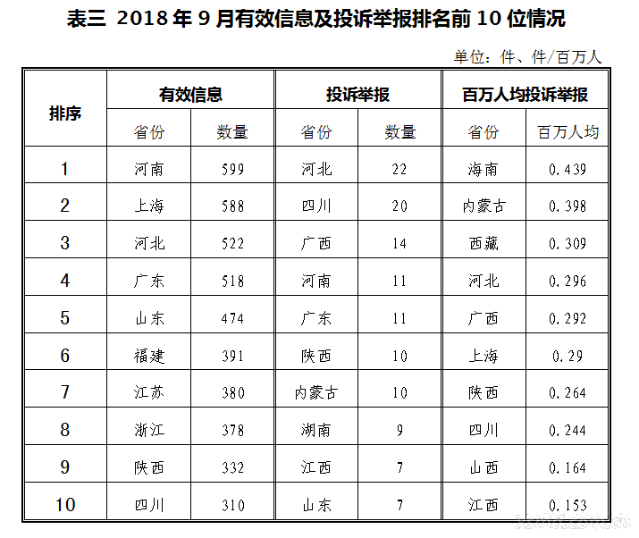 各省(自治區、直轄市)按照收到的有效信息數量排序,河南、上海、河北、廣東、山東等列全國前10位;按照投訴舉報數量排序,河北、四川、廣西、河南、廣東等排在全國前10位。按照百萬人均投訴舉報數量排序,海南,內蒙古,西藏,河北,廣西等排在全國前10位。(2018年9月有效信息及投訴舉報排名前10位情況見表三)