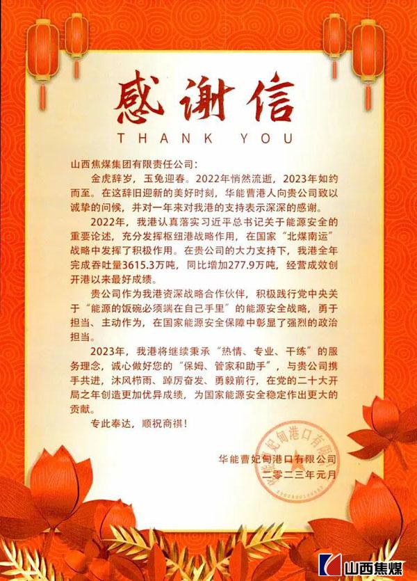近日,山西焦煤收到華能曹妃甸港口有限公司發來的感謝信,對山西焦煤過去一年來為能源保供工作作出的重要貢獻表示衷心感謝。