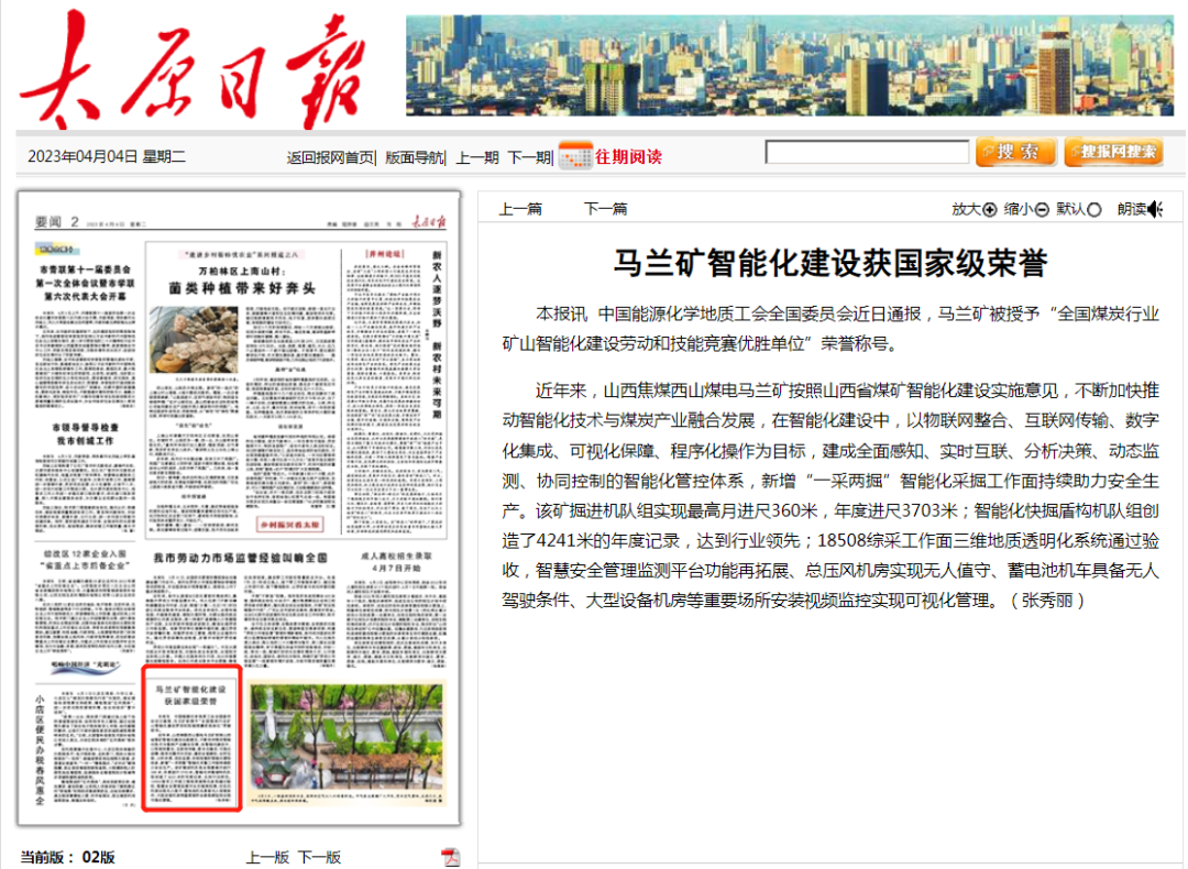 【太原日報】山焦西山馬蘭礦智能化建設(shè)獲國家級榮譽