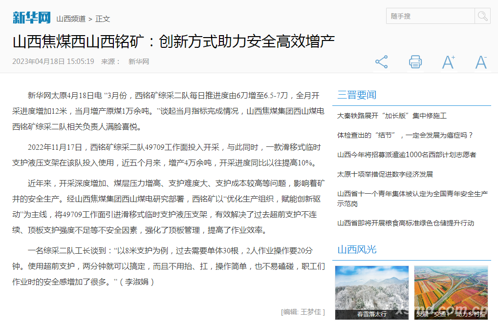 2022年11月17日,西銘礦綜采二隊49709工作面投入開采,與此同時,一款滑移式臨時支護液壓支架在該隊投入使用,近五個月來,增產4萬余噸,開采進度同比以往提高10%。近年來,開采深度增加、煤層壓力增高、支護難度大、支護成本較高等問題,影響著礦井的安全生產。經山西焦煤集團西山煤電研究部署,西銘礦以“優化生產組織,賦能創新驅動”為主線,將49709工作面引進滑移式臨時支護液壓支架,有效解決了過去超前支護不連續、頂板支護強度不足等不安全因素,強化了頂板管理,提高了作業效率。一名綜采二隊工長談到:“以8米支護為例,過去需要單體30根,2人作業操作要20分鐘。使用超前支護,兩分鐘就可以搞定,而且不用抬、扛,操作簡單,也不易磕碰,職工們作業時的安全感增加了很多。”