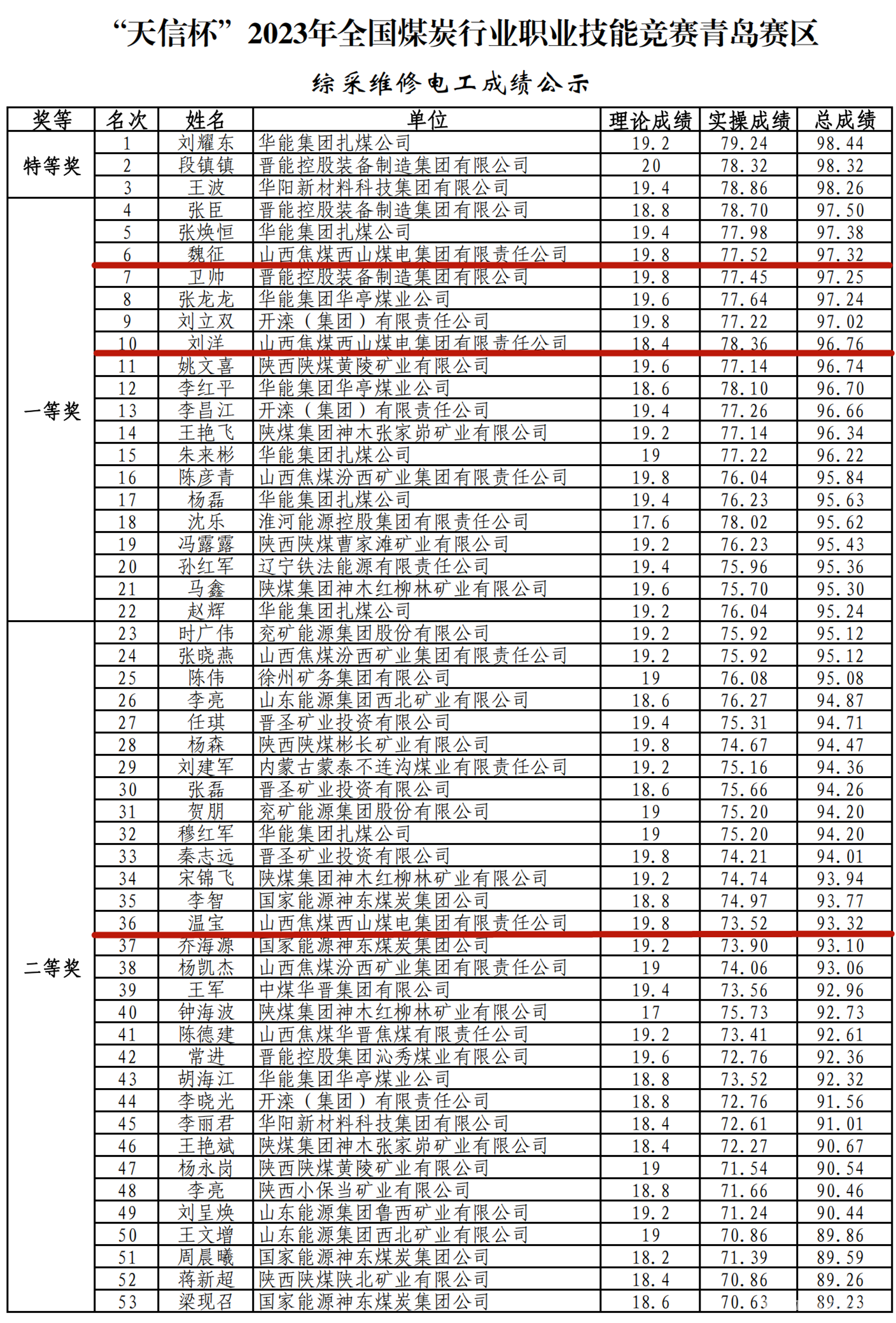 近日,“天信杯”2023年全國煤炭行業(yè)職業(yè)技能競賽(青島賽區(qū))綜采維修電工成績揭曉,山西焦煤西山煤電選手?jǐn)孬@佳績,其中東曲礦魏征、西銘礦劉洋榮獲一等獎(jiǎng),斜溝煤礦溫寶榮獲二等獎(jiǎng)。