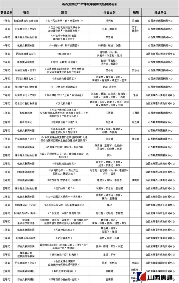 在山西焦煤獲獎的32件新聞作品中,山西焦煤新聞中心選送的深度報道《從“民生清單”到“幸福賬單”》、西山煤電選送的新聞名專欄《侃侃而談》等5件作品獲一等獎;山西焦煤新聞中心選送的消息文字《山西焦煤2022年度第一期中期票據創全國省屬煤企最低發行利率》、霍州煤電選送的行業形象傳播《文化的力量》等6件作品獲二等獎;汾西礦業選送的新聞專題《心懷家國的兵媽媽——梁秀娥》、山煤國際選送的新聞攝影《煤矸石的華麗蛻變(組照)》等21件作品獲三等獎。