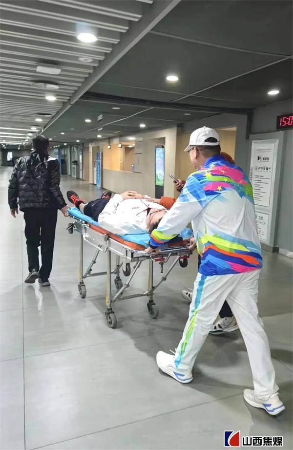 面對突發(fā)情況,來自山西焦化的志愿者王凱軍趕緊上前將受傷的運動員扶起并帶離比賽場地。另一位志愿者張力琳第一時間聯系了醫(yī)護人員,并快速將手推床推到傷員面前。