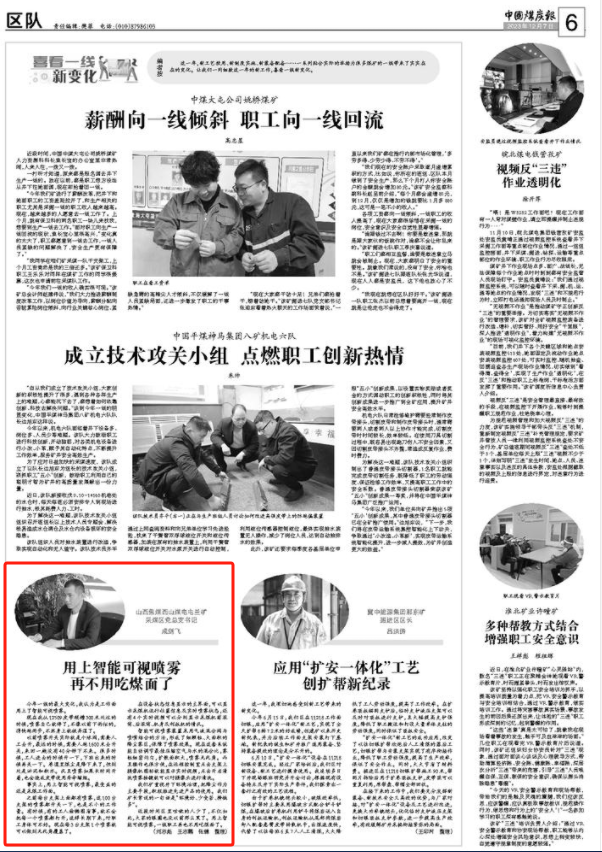 近段時間區里咳嗽的人少了,不僅如此,大家的眼圈也沒以前那么黑了。用上智能可視噴霧,一線職工再也不用吃煤面了。(山西焦煤西山煤電屯蘭礦采煤區黨總支書記?成劍飛)