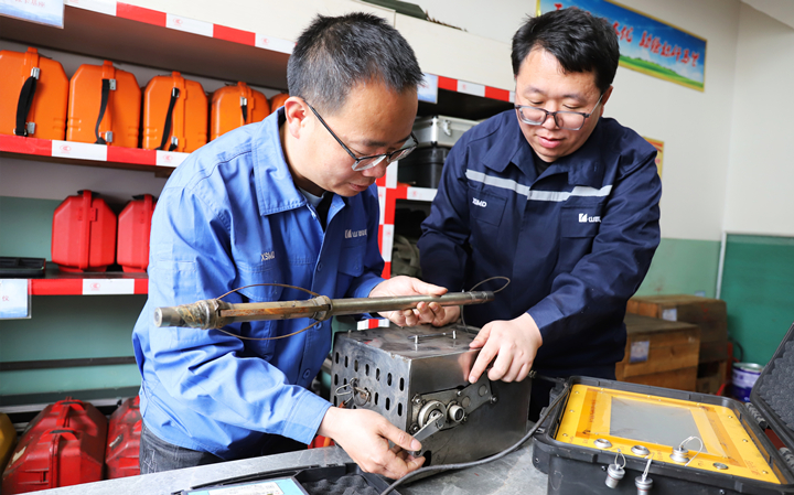 (技術(shù)人員正調(diào)試鉆孔測(cè)井分析儀)
